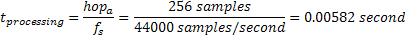 As mentioned before, the sampling rate used is 44000 samples per second. Each frame is made of 1024 samples and frames have a 75% overlapping. This implies that after each block of 256 samples a new frame is ready for being processed. The maximum time available for processing a frame of 1024 samples is therefore given by equation 5.1.