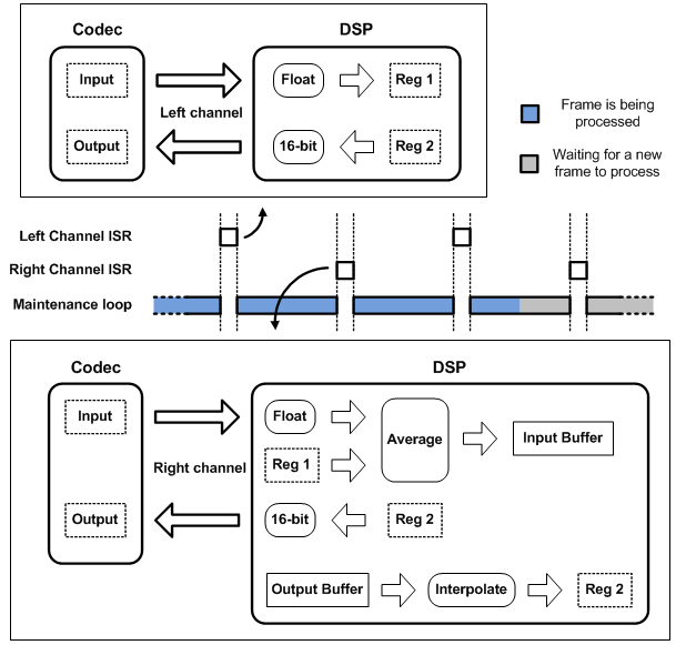 While a frame is being processed, the incoming samples need to be stored in a buffer before they can be processed and this is done with an interrupt service routine (ISR) that halts the current frame processing. Since the codec has a stereo input, the interrupt is triggered for each channel when a sample is ready. When the codec interrupts because a new sample is ready on the left channel, this sample is stored in a temporary memory location. When the codec interrupts because a new sample is ready on the right channel, the value of this sample is averaged with the previous value from the left channel and the result is sent to the input circular buffer. This is done since processing is done on a mono signal. The samples are converted from 16-bit signed format to single precision float format.