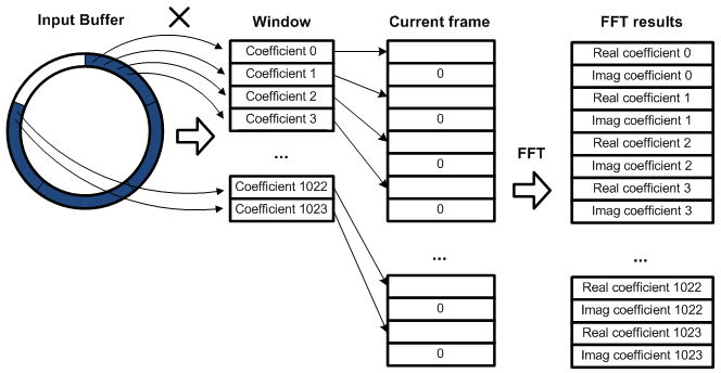 As mentioned before, the input buffer is a circular buffer. This buffer is made of five sectors with the size of the analysis hop size, which results in a buffer size of 1280 samples. The writing pointer is incremented each time a sample is written and wraps around at index 1279. When four sectors are full, all samples of this frame are copied to a linear array which is the current frame to be processed. Before being copied, each sample is multiplied by its corresponding window coefficient in order to perform windowing as described in equation 3.1. The linear array is designed to receive complex numbers. Each even index (0, 2, … , 1022) represents the real part and each odd index (1, 3, … , 1023) represents the imaginary part. Since the initial signal is real, all imaginary elements are set to zero. The Fast Fourier Transform is then computed from the current frame values. The routine from Texas Instrument is used for this purpose. The latter is very efficient as it makes use of the specific architecture of the DSP to speed up computations (e.g. bit-reverse order indexing). The overall process is shown in figure 5.2.