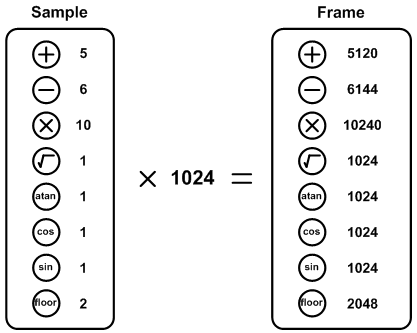Once the FFT is performed, the processing is performed. Equations 3.2, 3.3, 3.4, 3.5, 3.6 and 3.7 are computed for each value of k, where k goes from 0 to 1023 since there are 1024 samples per frame. The overall number of computations (in floating-point) for each frame is summarized in figure 5.3. A floor operation is similar to a rounding operation except that the fractional part is always discarded.