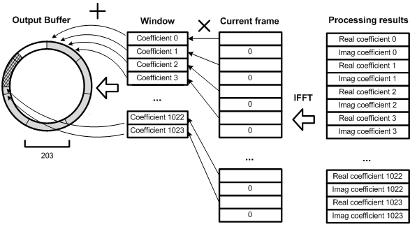 This implies that the output buffer size must be at least 2261 samples (7x323). This is rounded up to 2300. The index wraps around at the output frame size minus one. The overall process is shown in figure 5.4 for a synthesis hop size of 203 samples. The dashed zone in the buffer represents data that are reset to zero.