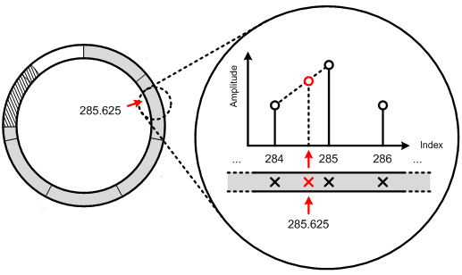 As explained before, resampling is used to achieve pitch shifting after time scaling. In this case, a reading pointer jumps at different places on the output buffer in order to retrieve output samples. Most of the time, the sample index desired is not an integer number. This is due to the fact that the reading pointer is incremented by the scaling factor, which is not an integer. When a non-integer index is desired, linear interpolation is used to get the best approximation. For instance, if the desired index is 285.625, an approximation is obtained from the values associated with index 285 and 286. This is shown in figure 5.5.